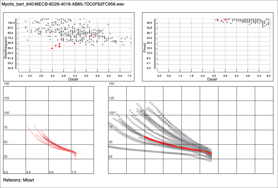 Daneben messen wir diverse andere Steigungen und Frequenzen zum Beispiel in der Mitte des Rufs, am Ort geringster Steigung oder in der Mitte der Rufbandbreite. Diese Werte gehen in die Rufbestimmung ebenso mit ein, wie zum Beispiel aus diesen abgeleitete Werte. So können wir erstmalig automatisch Ruftypen wie fm, fm-qcf und qcf ermitteln.