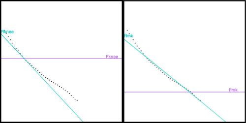 Bestimmen wir Arten zum Beispiel aus der Gattung Myotis mit Hand, dann achten wir auf die Steigung der Rufe und verschiedene Punkte, an denen sich die Steigung ändert. Wir suchen dann zum Beispiel den Myotis-Knick. Nun lässt sich das natürlich auch bei einer automatischen Vermessung nutzen. Wir machen es dann noch etwas komplizierter, indem wir noch über Teilstücke der Rufe mitteln. So lassen sich Messungs-bedingte Schwankungen gut ausgleichen. Und schon können wir in der Rufbestimmung auch solche Messwerte verwenden. Inklusive der Steigungen am Punkt und der Winkel. Das Bild zeigt zum Beispiel die Werte Fknee, Rknee (Steigung), Fmk und Rmk.
