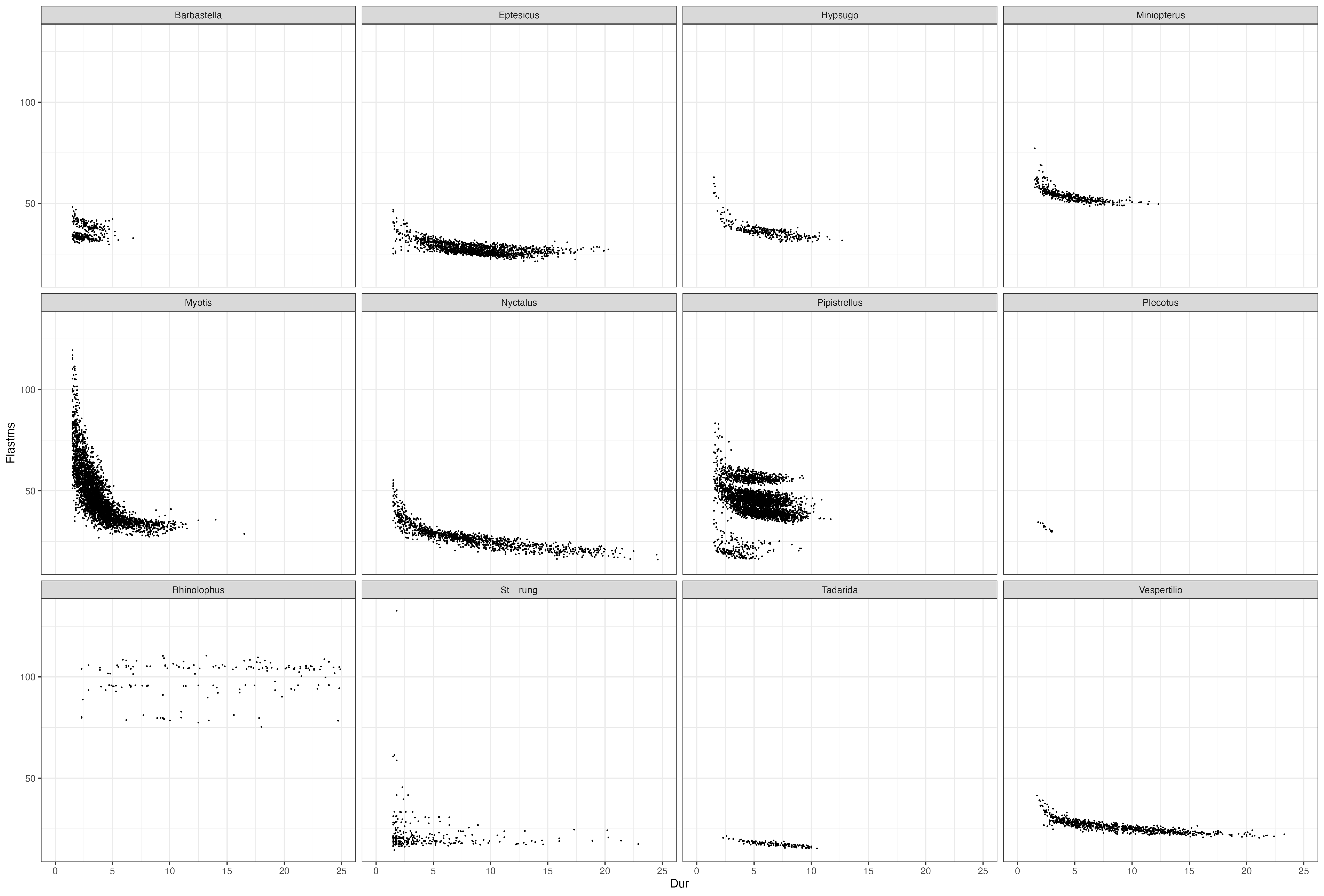 Ein Modell zur Unterscheidung von Arten anhand ihrer Rufe muss so trainiert werden, dass die Streuung der Messwerte mit beinhaltet ist. Wenn es sich um eine durch die Fledermaus verursachte Streuung handelt. Entsteht die Streuung nur auf Grund schlechter Aufnahmequalität, dann wiederum kann sie sehr störend sein. Leider ein Dilemma, denn in der täglichen Anwendung wiederum werden immer wieder Aufnahmen verarbeitet, die eine geringe Qualität aufweisen. Dies lässt sich nicht verhindern, da Fledermäuse nicht gezwungen werden können, optimal ins Mikrofon zu rufen. Im Bild eine Übersicht von Rufen einer Bartfledermaus, die zumeist nicht vollständig aufgezeichnet wurden.